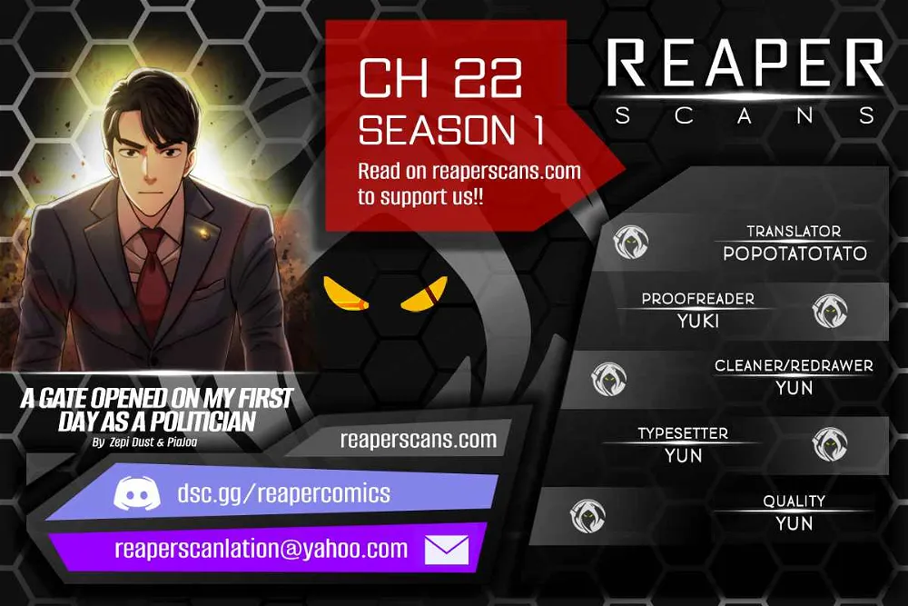 Read the latest manga A Gate Opened on my First Day as a Politician 22 at Arenascans . Manga A Gate Opened on my First Day as a Politician is always updated at Arenascans . Dont forget to read the other manga updates. A list of manga collections Arenascans is in the Manga List menu.