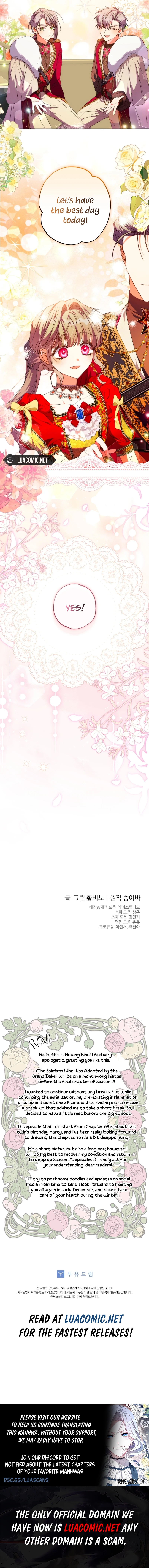 Read the latest manga A Saint Who Was Adopted by the Grand Duke 62 at Arenascans . Manga A Saint Who Was Adopted by the Grand Duke is always updated at Arenascans . Dont forget to read the other manga updates. A list of manga collections Arenascans is in the Manga List menu.