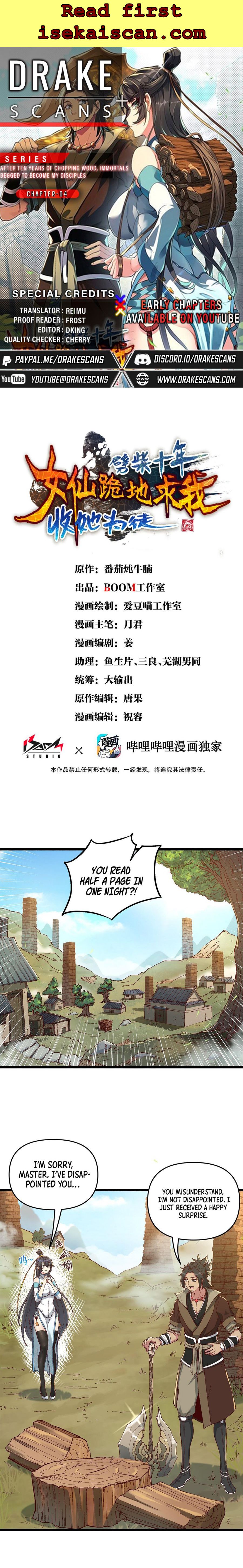 Read the latest manga After Ten Years of Chopping Wood, Immortals Begged To Become My Disciples 4 at Arenascans . Manga After Ten Years of Chopping Wood, Immortals Begged To Become My Disciples is always updated at Arenascans . Dont forget to read the other manga updates. A list of manga collections Arenascans is in the Manga List menu.