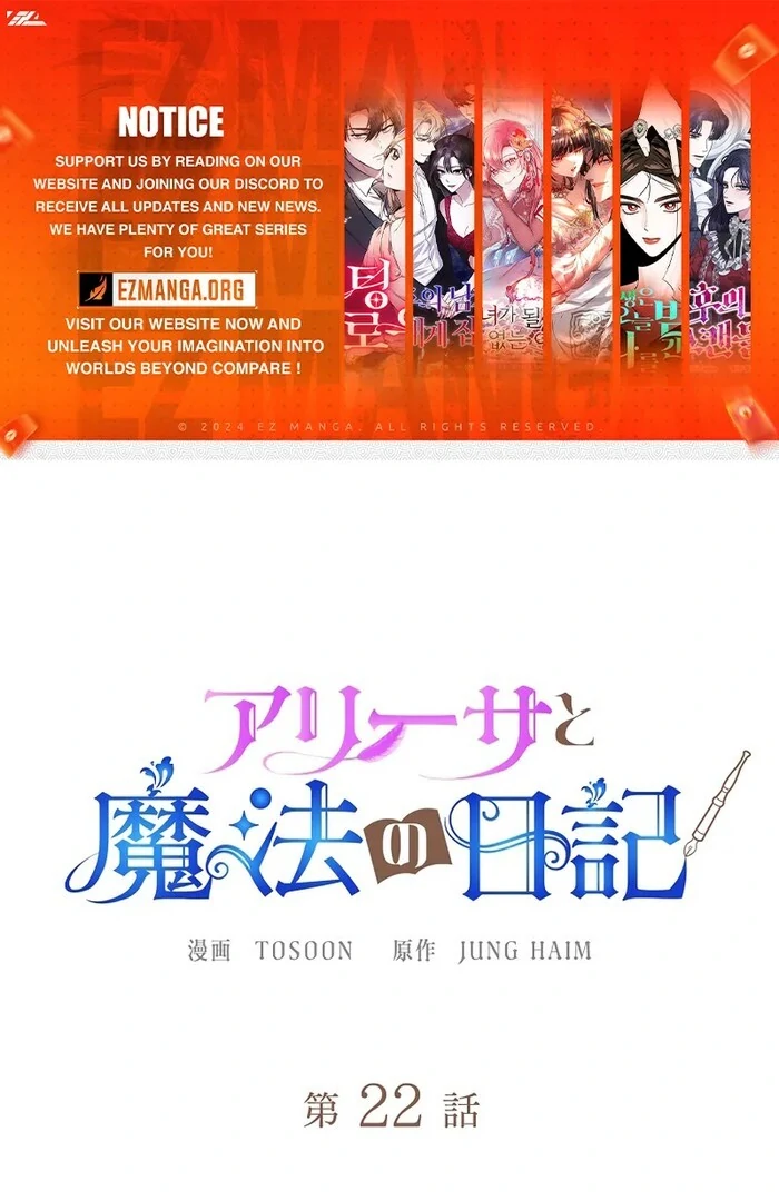 Read the latest manga Alissa and the Magic Diary 22 at Arenascans . Manga Alissa and the Magic Diary is always updated at Arenascans . Dont forget to read the other manga updates. A list of manga collections Arenascans is in the Manga List menu.