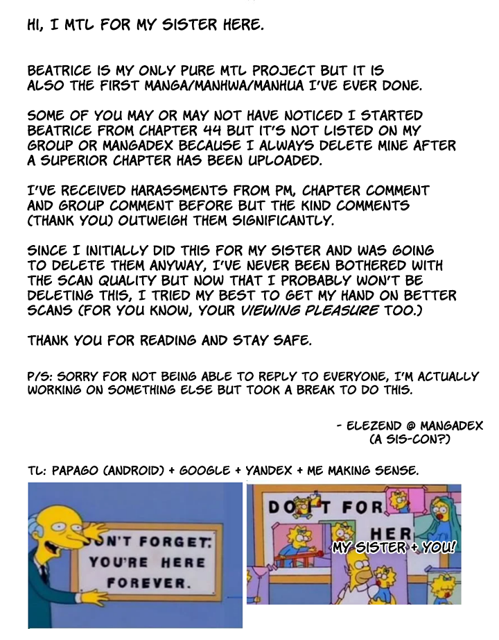 Read the latest manga Beatrice 52 at Arenascans . Manga Beatrice is always updated at Arenascans . Dont forget to read the other manga updates. A list of manga collections Arenascans is in the Manga List menu.