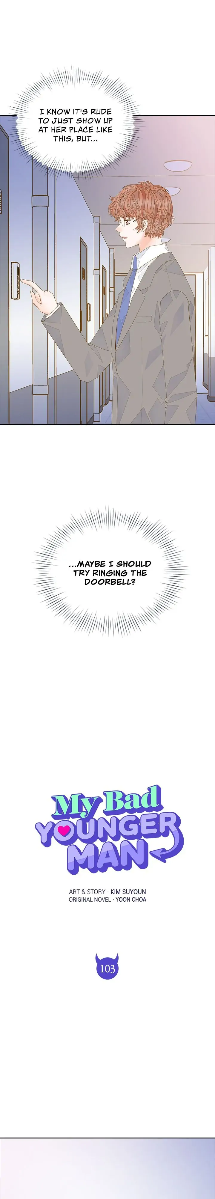Read the latest manga My Bad Younger Man 103 at Arenascans . Manga My Bad Younger Man is always updated at Arenascans . Dont forget to read the other manga updates. A list of manga collections Arenascans is in the Manga List menu.