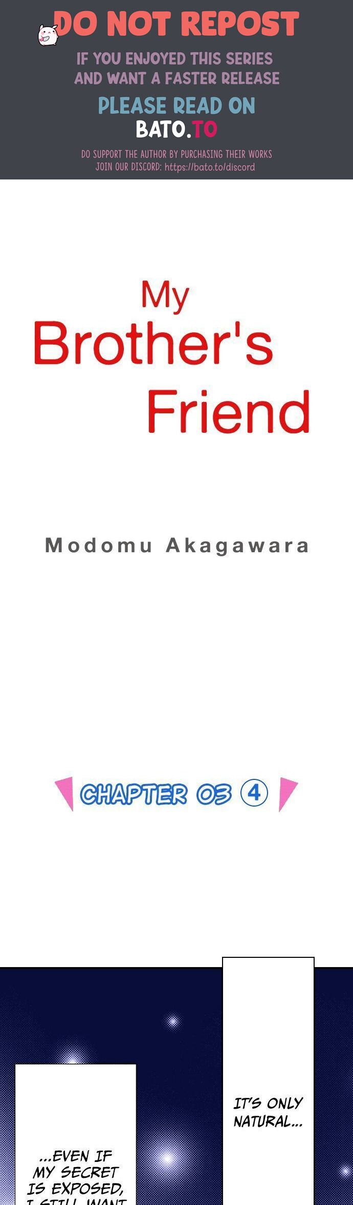 Read the latest manga My Brother’s Friend 12 at Arenascans . Manga My Brother’s Friend is always updated at Arenascans . Dont forget to read the other manga updates. A list of manga collections Arenascans is in the Manga List menu.