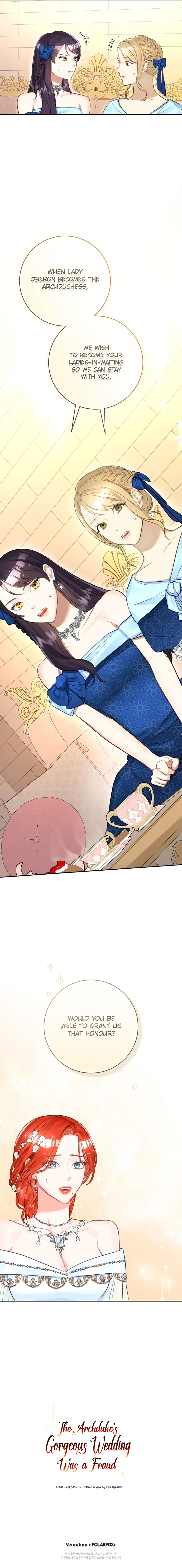 Read the latest manga The Archduke’s Gorgeous Wedding Was a Fraud 38 at Arenascans . Manga The Archduke’s Gorgeous Wedding Was a Fraud is always updated at Arenascans . Dont forget to read the other manga updates. A list of manga collections Arenascans is in the Manga List menu.