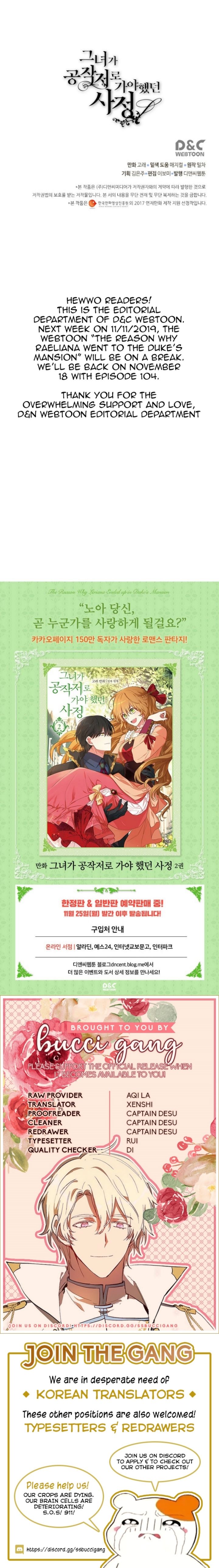 Read the latest manga The Reason Why Raeliana Ended up at the Duke’s Mansion 103 at Arenascans . Manga The Reason Why Raeliana Ended up at the Duke’s Mansion is always updated at Arenascans . Dont forget to read the other manga updates. A list of manga collections Arenascans is in the Manga List menu.