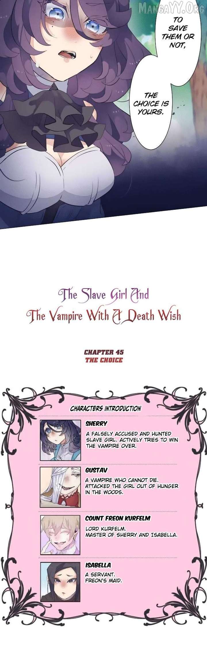 Read the latest manga The Slave Girl And The Vampire With A Death Wish 45 at Arenascans . Manga The Slave Girl And The Vampire With A Death Wish is always updated at Arenascans . Dont forget to read the other manga updates. A list of manga collections Arenascans is in the Manga List menu.