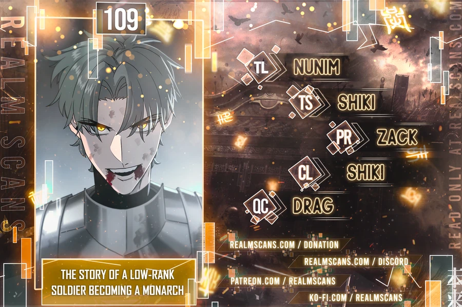 Read the latest manga The Story of a Low-Rank Soldier Becoming a Monarch 109 at Arenascans . Manga The Story of a Low-Rank Soldier Becoming a Monarch is always updated at Arenascans . Dont forget to read the other manga updates. A list of manga collections Arenascans is in the Manga List menu.